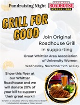Our November Dining For $$$ event is happening on Wednesday 11/19/25 from 11 AM to 9 PM, NOT THURSDAY, Mystery Mavens meets here on Wednesday. The Original Roadhouse Grill; featuring steaks (hand cut daily, grilled over mesquite), BBQ, ribs, burgers, chicken sandwiches, salads, freshly baked rolls, full bar and more. Dine in only for Dining for Dollars. 15156 E. Whittier Blvd. Located just west of the Whittwood shopping center next to Harbor Freight. There is ample parking. Please support this local restaurant for their generous support of the Myra Long Scholarship Fund.